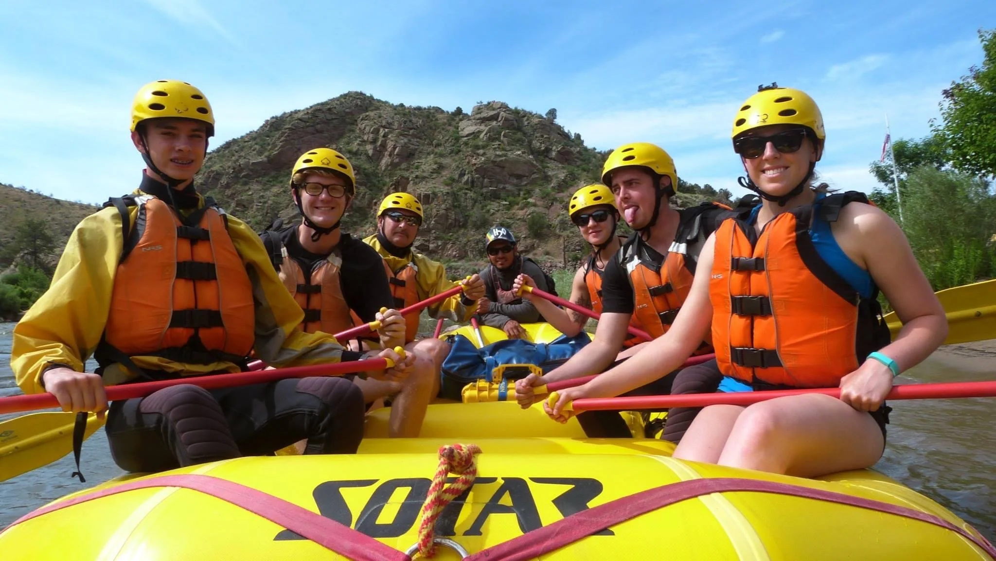 Group of seven people in yellow helmets and life jackets on a yellow raft on a river during a whitewater rafting adventure.